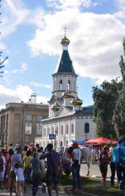 | Военный Воскресенский собор был построен в 1773 году, под руководством зодчего и летописца Ивана Черепанова. В этом соборе молился Ф.М.Достоевский и писал о нем в книге "Записки из Мертвого дома". Закрыт в начале 1920-х и передан под клуб военных. Пустовал и разрушался в течение многих лет. Снесен в конце 1950-х при строительстве рядом жилого дома. На месте собора разбит сквер, а в нем стоял памятный знак. Выстроен заново в 2016 году. |