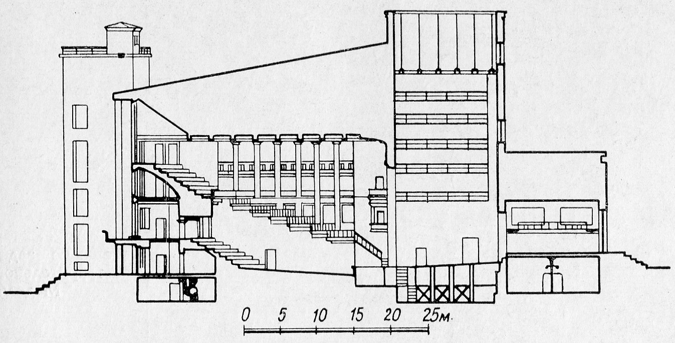 "Схематический продольный разрез дворца культуры" — рисунок из издания "Из творческого опыта : Возникновение и развитие архитектурного замысла / А. И. Гегелло ; Институт теории и истории архитектуры АСиА СССР. — Ленинград : Государственное издательство литературы по строительству, архитектуре и строительным материалам, 1962. — 376 с., ил. (с.72)